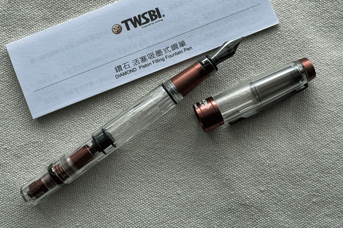 TWSBI pens made by one of Taiwan's most experience pen maker who started out as a contract manufacturer. The Diamond features a clear demonstrator body with a piston filling mechanism; these attributes combined with its low price make for a very enticing pen. New aluminium machine grip, connector and piston rod. The body is made of a round plastic allowing you to see the internal piston mechanism and the feed. Improved grip and end barrel section compared to 540, 580 has increased ink capacity, about 30% more than 530, 580 has improved the smoothness of cap thread turning